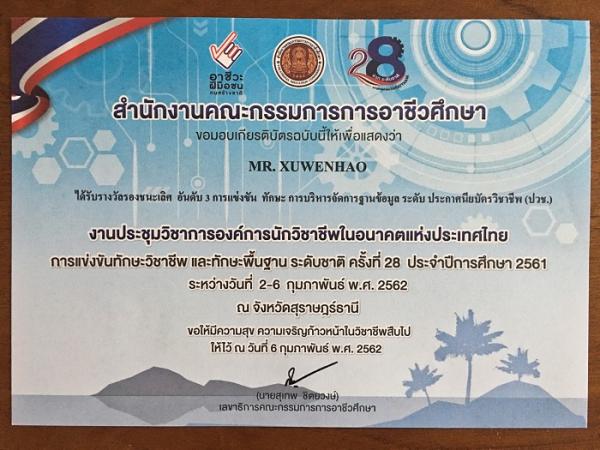 网页管理竞赛由我院信息技术系计算1601班徐文昊与国际教育系物联1681班徐钢同学组队参加。该赛项也持续3天,内容包括数据库设计、系统开发以及最终系统展示与交叉答辩等。该项比赛有包含来自东道主、中国、印尼、菲律宾、马来西亚、老挝等19支队伍参加,除语言沟通障碍以外,东道主直接计入排名,因此竞争尤为激烈。两位同学与指导老师积极配合、稳打稳扎,继比赛第一、二两天按计划完成预定项目后,第三天又连续近40分钟进行了全英文系统展示与交叉答辩。他们的技术基础能力与答辩表现得到评委认可,最终在无人获得金奖的情况下,与东道主的其他3支队伍并列获得该赛项银奖!