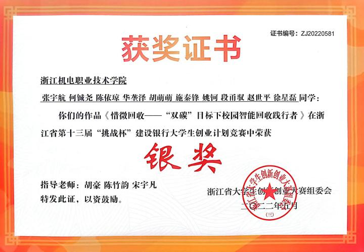 6月2日,浙江省第十三届“挑战杯”大学生创业计划竞赛在浙江农林大学落下帷幕。我院由胡豪、陈竹韵、宋宇凡老师指导,张宇航同学负责的《惜微回收——“双碳”目标下校园智能回收践行者》获省赛银奖!