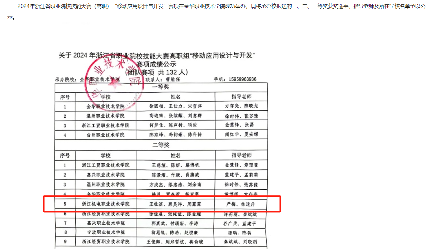 近日,2024年浙江省职业院校技能大赛高职组“移动应用设计与开发”赛项在金华职业技术学院成功举办,我院严梅老师带领的参赛师生团队积极备赛,历经数月准备,在比赛中表现优异,喜获浙江省二等奖佳绩!这一成绩刷新了taptap点点在该赛项上的最好记录。