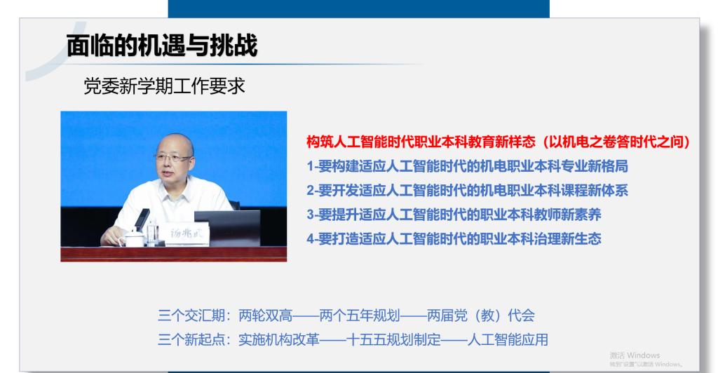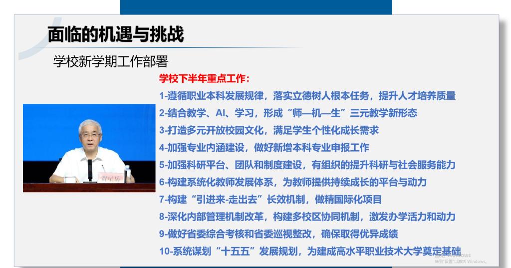 会上,学院院长王耀军总结了学院上半年工作成果,并对下半年重点任务作出部署。他传达了校党委书记汤兆武《以机电之卷答时代之问——构筑人工智能时代职业本科教育新样态》的主题报告精神,要紧紧围绕“三化一体系一屏障”发展思路,从专业、课程、教师和治理体系四个维度,为构建适应人工智能时代的机电职业本科教育新生态不断探索、实践。他还传达了校长贺星岳在2025年中层干部暑期培训班的讲话精神,指出要围绕立德树人的根本任务,积极构建“引进来-走出去”长效机制,做精国际化项目,并系统谋划学院“十五五”发展规划。