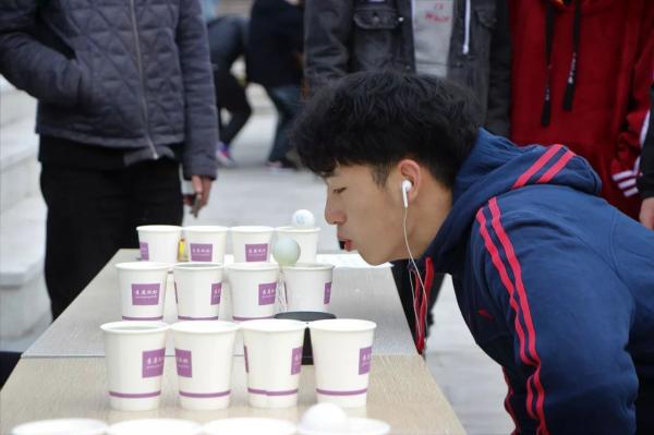 游戏规则:准备四个杯子,每个杯子都要装满水,并排成一排。在第一个杯子里放一个乒乓球。游戏者要将乒乓球从第一个杯子吹向另一个杯子,一个一个地吹,不能跳杯子。若乒乓球吹落了,则不能得奖。若一次性吹完则得奖。每人有两次机会。