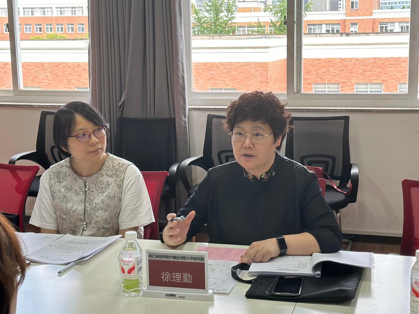 会议论证组专家由浙江科技大学中德应用型大学研究院院长、教育部高校“德语国家”国别和区域研究中心主任徐理勤教授、杭州领聚创海信息咨询有限公司总经理李姿女士、杭州泰若医疗器械科技有限公司副总裁卢雪娇高级工程师、浙江苏泊尔厨卫电器有限公司工业设计经理冯峥、浙江天下网商网络传媒有限公司资深Java开发工程师臧义蕾女士等组成,徐理勤教授任组长。学院院长陶宇教授、中英数字化联合学院专业负责人郁元正、陈竹韵、查娟、沈佳彬老师及学院教学办科长胡茜共同参会,会议由学院副院长张伟中主持。