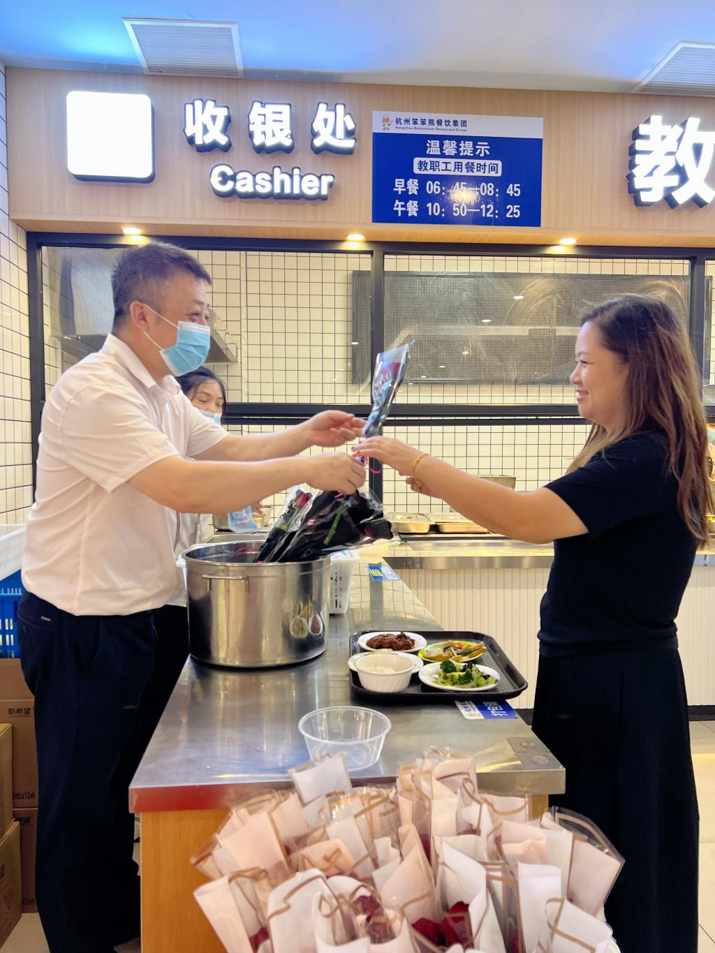 9月10日中午,教工餐厅焕然一新,每一位前来食堂用餐的教师都收到了笨笨熊精心准备的芬芳花束或甜品。娇艳的鲜花映衬着教师们欣慰的笑容,温馨的祝福语传递着深深的敬意。餐厅里处处洋溢着节日的喜悦,空气中弥漫着感恩的温度。这份特别的礼物,不仅是对教师们的节日问候,更是对教育事业的无上礼赞。
