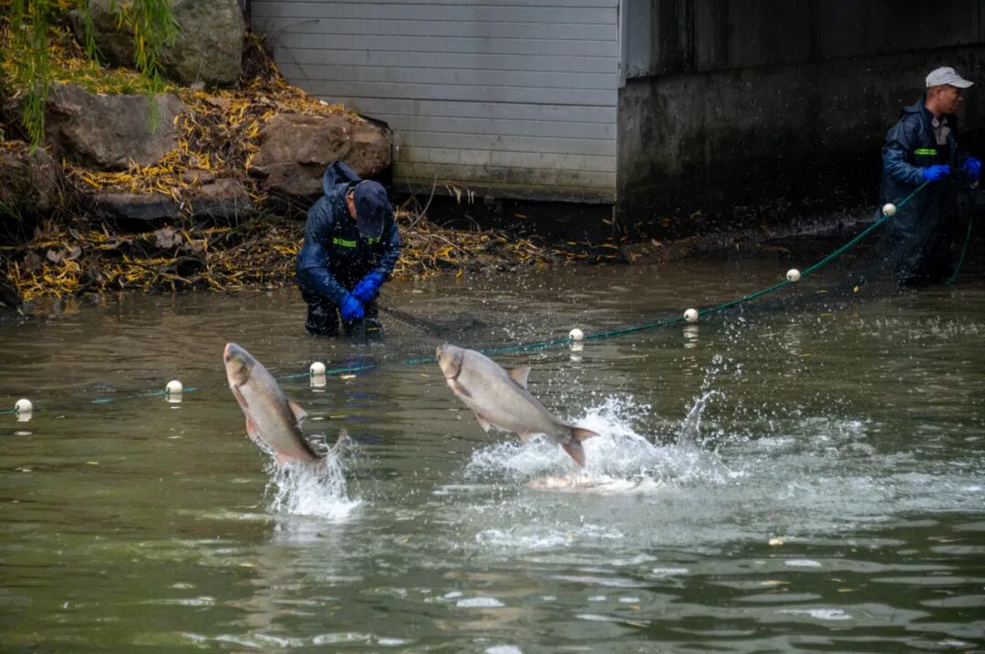 上午9时,校园里桑梓河畔已聚集了众多师生。“快看,网动了!”“那边有鱼跳起来了!”伴随着阵阵期待的欢呼,捕鱼活动正式开始。