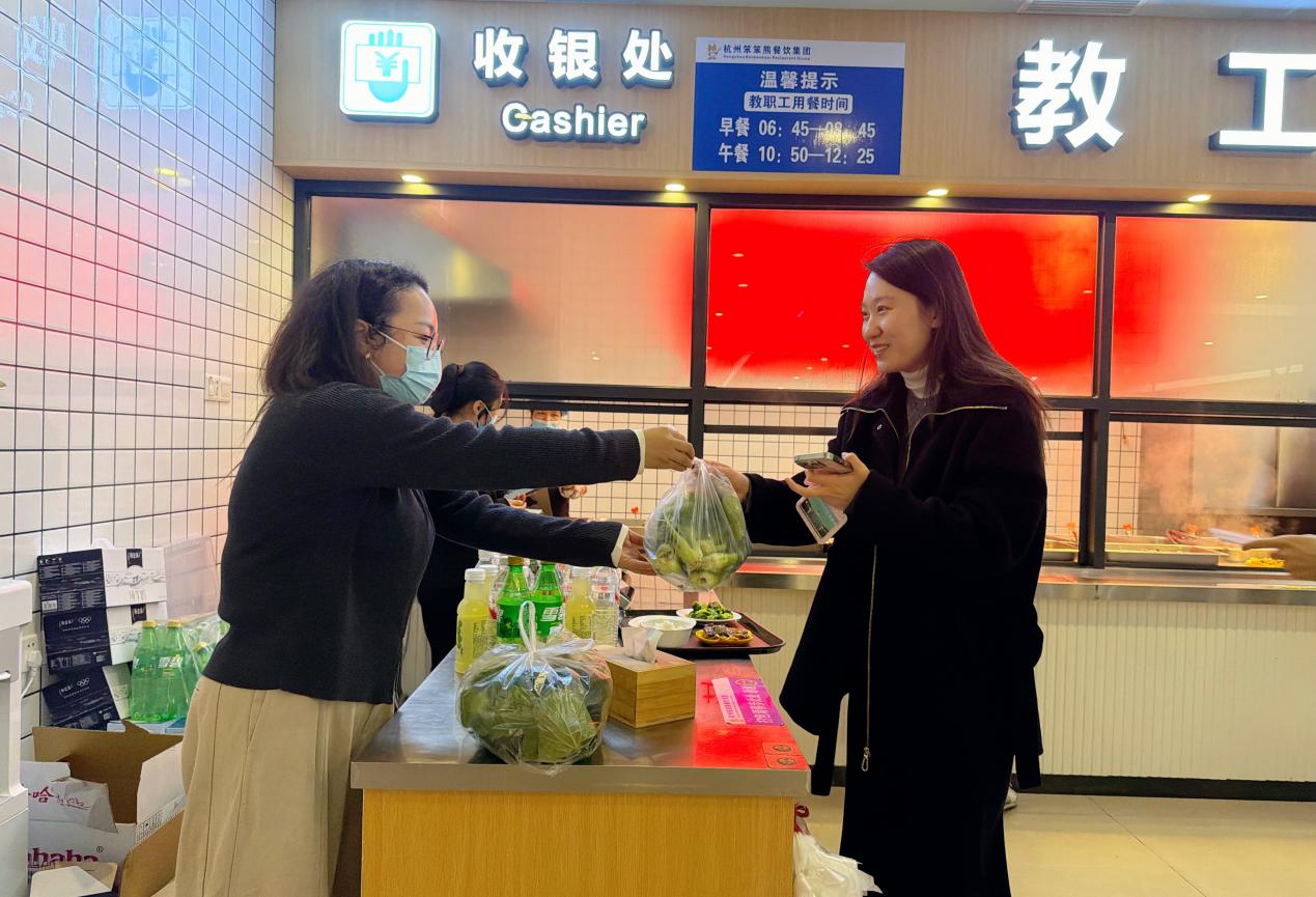 为保证蔬菜的最佳品质,后勤工作人员于当天清晨进行采摘,经过仔细采摘、分拣去杂,和劳模班学生将一棵棵鲜嫩饱满的青菜整齐分装、打包,将一份份翠绿欲滴的青菜运送至食堂教职工餐厅分发点。午餐时段,为前来用餐的教职工送上这份承载着温暖的生活惊喜。接过带着晨露气息的青菜,老师们脸上满是笑意,纷纷称赞这一举措既贴心又实在,让校园生活更有温度。