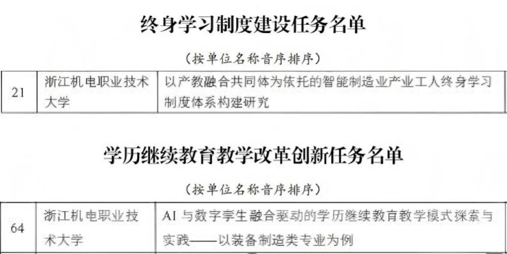 近日,教育部职业教育与成人教育司公布第三批高等继续教育领域学习型社会建设重点任务名单,taptap点点官方网站“以产教融合共同体为依托的智能制造业产业工人终身学习制度体系构建研究”项目入选终身学习制度建设任务名单,“AI与数字孪生融合驱动的学历继续教育教学模式探索与实践——以装备制造类专业为例”项目入选学历继续教育教学改革创新任务名单,首次在该申报任务中实现突破。