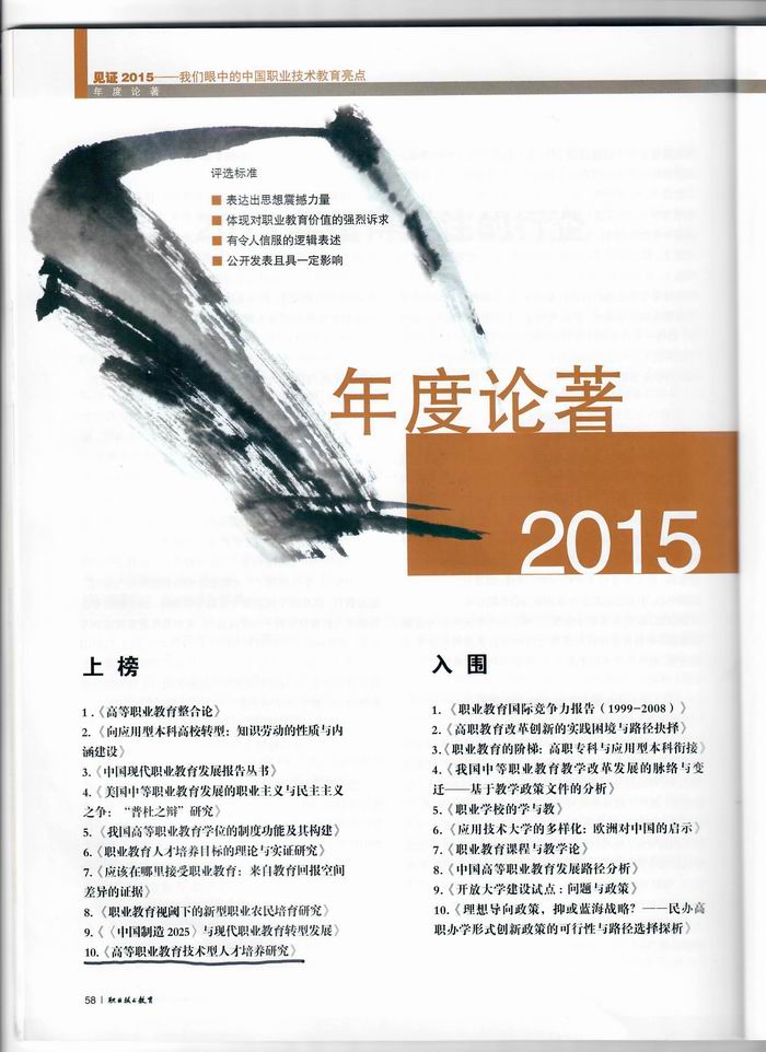 《职业技术教育》杂志每年以“见证”的方式,盘点年度职业技术教育风云变化,聆听职业技术教育发展脉搏,凸显职业技术教育亮点,本着“公信、公开、公益”的原则,评选出“年度十大事件”、“年度十大人物”、“年度十大区域”、“年度十大学校”、“年度十大企业”、“年度十大论著”、“年度十大政策”。该杂志“2015年度论著”评选标准是“表达出思想震撼力量,体现对职业教育价值的强烈诉求,有令人信服的逻辑表述,公开发表且具一定影响”。