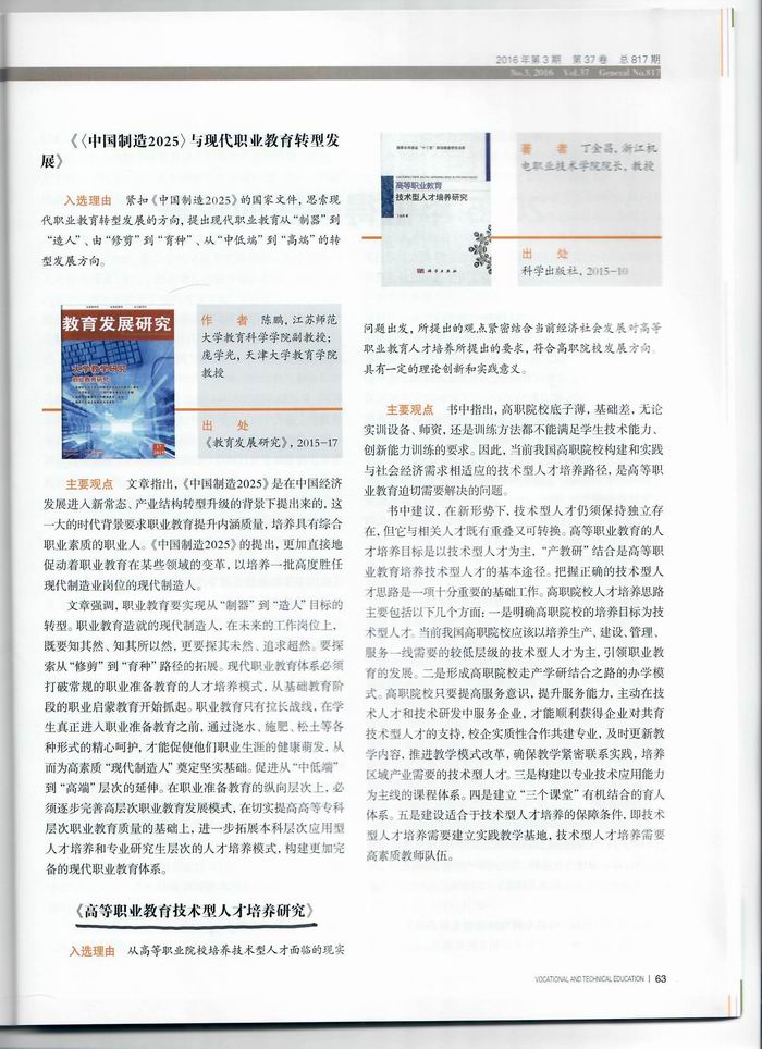 近日,由中国期刊方阵双效期刊、全国中文核心期刊、REESE核心期刊《职业技术教育》杂志评选出了2015年度全国职业教育领域十大论著,我院丁金昌院长专著《高等职业教育技术型人才培养研究》一书荣耀上榜。