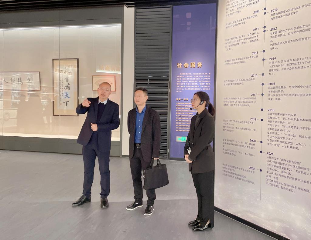 陈明锋一行首先参观了浙江机械工业博物馆。博物馆记录和展示了浙江从传统机械行业向先进制造业转型升级的高质量发展蝶变的不平凡的历程,也是浙江奋力推进“两个先行”,打造世界先进制造业和职教高地的重要展示窗口。博物馆收藏、保护浙江机械工业行业文物,展示行业历史发展、科学与人文内涵,是专业性极强的、特色鲜明的高校博物馆。