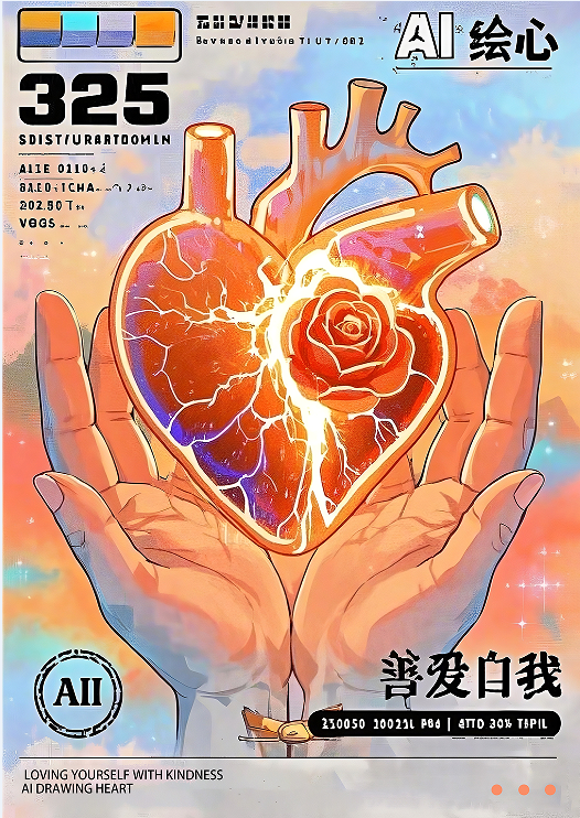 背景运用AI生成的水彩肌理,暖橙色光晕与冰蓝数据流形成冷暖碰撞,隐喻理性与感性的平衡。顶部325芯片造型采用荧光线条与半透明材质,数字内嵌微缩电路纹理。标题文字采用参数化设计,主标“AI绘心”以液态金属质感呈现科技柔性,副标“善爱自我”选用治愈系圆体字,通过字间距的呼吸感排列强化心理暗示。整体通过矢量图形与生成艺术的交融,构建具有未来诗意的视觉疗愈场域。——大数据2302 汪烨恺