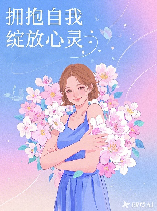 这张图片以柔和的色调和美丽的花卉为背景,传递出温暖和希望的信息。画面中的女性怀抱鲜花,象征着自我关爱和心灵的绽放。3月25日是“善爱我”心理健康日,提醒我们关注心理健康,学会自我接纳与成长。通过拥抱自我,我们可以更好地面对生活中的挑战,绽放心灵的光芒。让我们在这个特别的日子里,给予自己更多的理解和关爱。——物联2461 沈媛