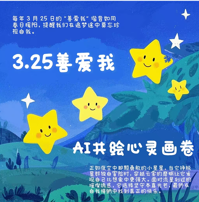 每年3月25日的“善爱我”,如同春日暖阳,提醒我们追梦时莫忘珍视自我。就像那颗勇敢的小星星,挣脱星群独自冒险,历经磨砺后发现自身比想象中更强大,并在坚守本真中找到快乐。每个人都是宇宙中独一无二的星辰,应用包容之心接纳完整的自己,如此方能让生命绽放最璀璨的光芒,成为夜空中永恒的风景。——云计算2302 曹彩月