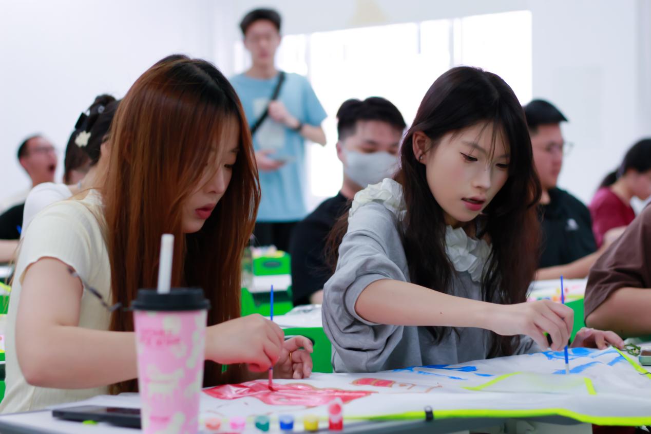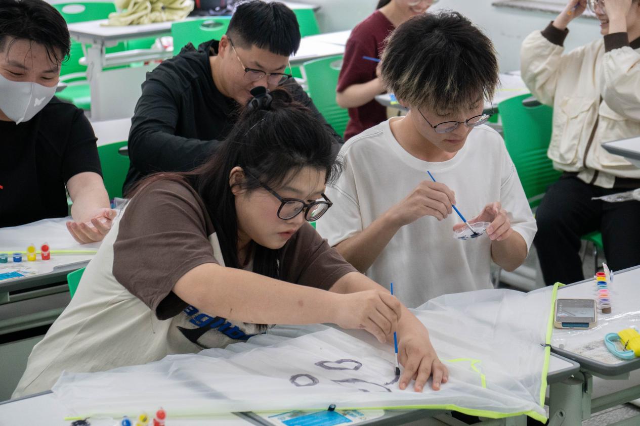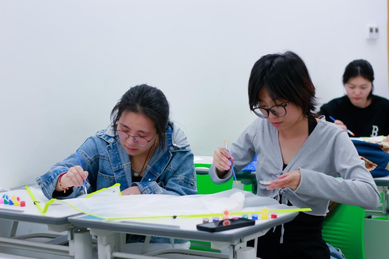 在风筝绘制的过程中,同学们两人一组,发挥创意,用颜料和画笔在空白风筝上绘制属于自己的独特作品,现场气氛轻松愉快。