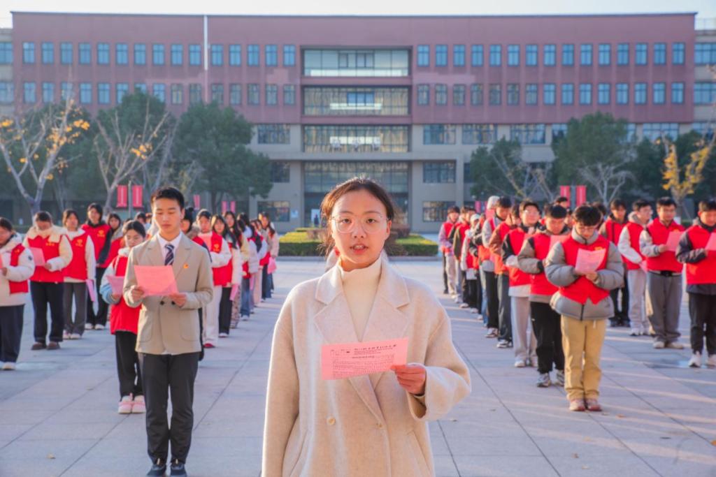 12月4日清晨,师生代表齐聚校园,以庄严仪式迎接“国家宪法日”。晨光中,朗朗诵读声响起,青年学子齐声朗读宪法条文,深刻感悟宪法精神。全体师生面向国旗庄严宣誓,“忠于中华人民共和国宪法,维护宪法权威”的誓言响彻校园。仪式上,师生在主题横幅上郑重签名,承诺自觉践行宪法精神,并齐声高唱《宪法伴我们成长》,在激昂旋律中让法治信仰深植于心。