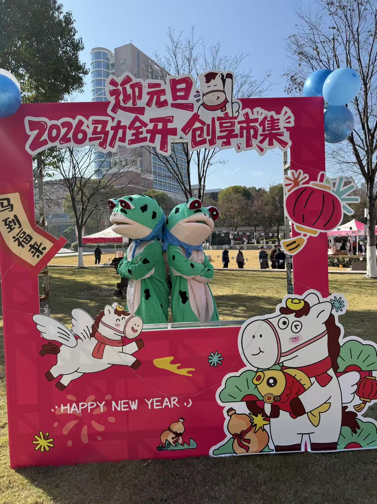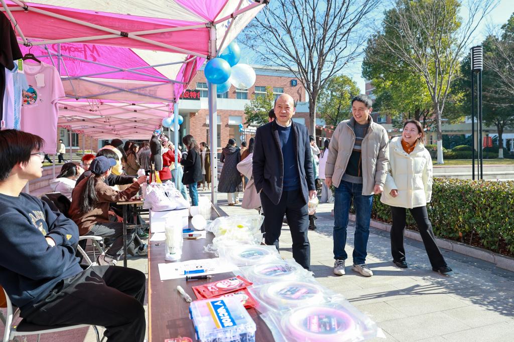在市集入口处,一方精心布置的拍照打卡区早已人头攒动。几位身着萌趣玩偶服的同学化身“人气明星”,被层层簇拥,争相合影。镜头前,大家摆出各式活泼俏皮的姿态,笑容在冬日的阳光下格外明亮。光影定格间,青春的欢愉与朝气,被悄然珍藏进这个值得留念的午后。