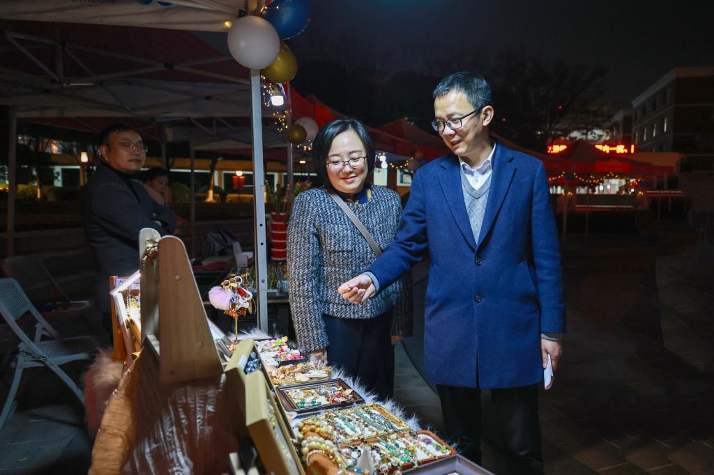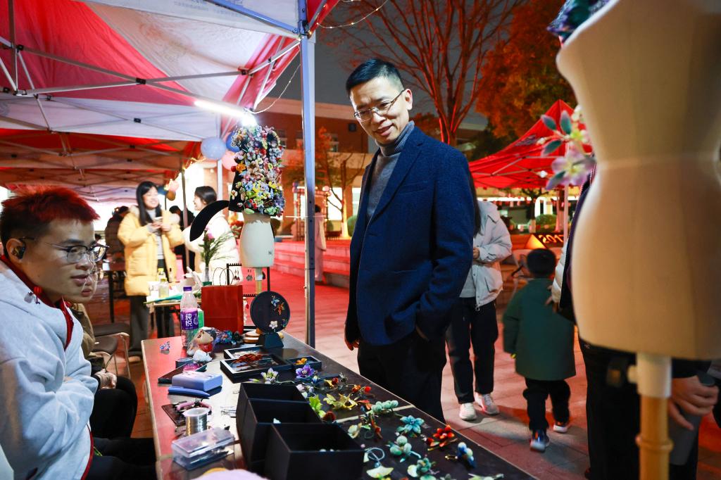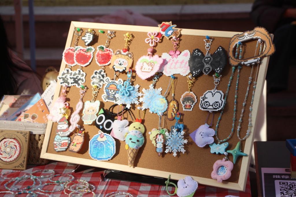 “壁上丹青”摊前,同学们屏息提笔,细细勾描,仿佛借一道墨线穿越千年,亲触敦煌壁画的温度与呼吸;“锦,喊你来看”则把古老织锦化入胸针、发夹之中,让典雅纹样跳动在青春的衣襟与发梢;另一隅,“我勒个豆豆豆”手工区里,彩色豆粒渐次成画,同学们俯首沉浸,在拼合之间拾得一份手作的专注与宁静;而“景瓷批发”携景德镇的清雅瓷韵而来,温润釉色映着笑语,让校园一角落入江南烟雨般的诗意。冰糖葫芦摊亮起暖澄澄的光,一串串山楂草莓裹着透亮的糖衣,像被封存起来的冬日阳光,咬下一口,酸甜交织的滋味瞬间漾开,成为许多人在这个午后最生动的味觉记忆。
