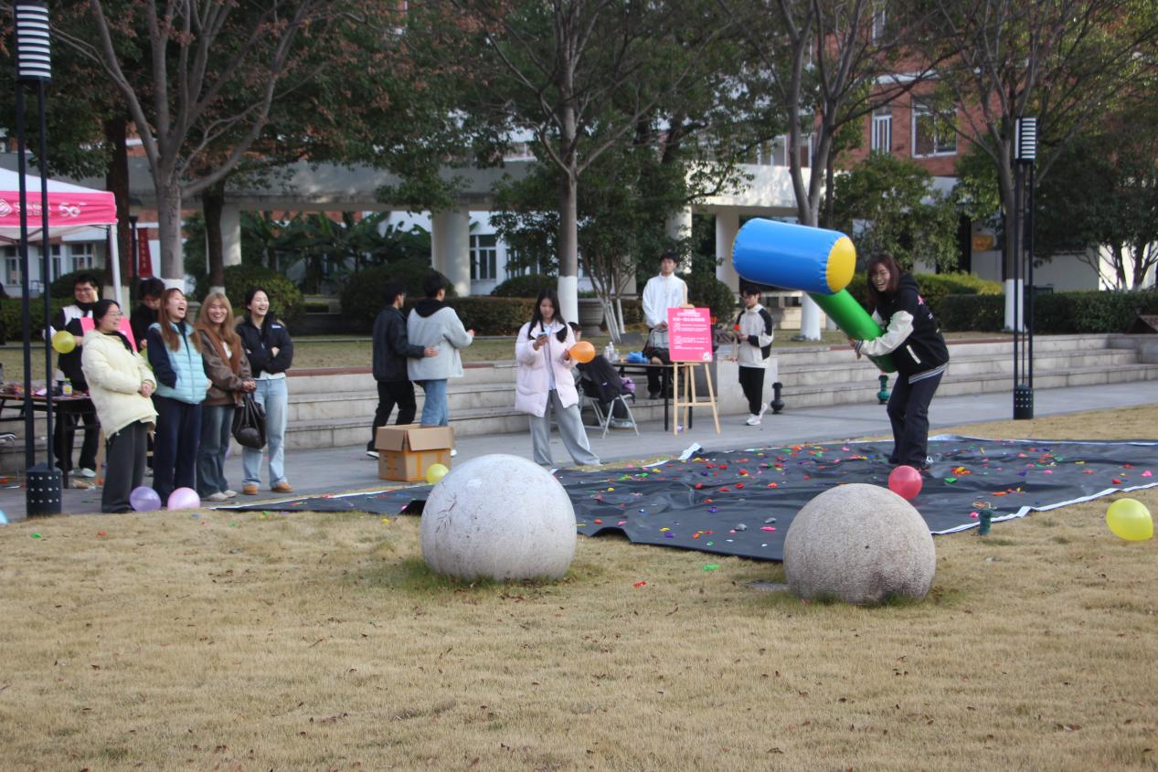 另一边,笑语与欢呼也层层漫开,趣味游戏区里青春的热力全然释放。同学们俯首在五彩的新年明信片上,一笔一画写下来年闪亮的期许。“投壶挑战”中,竹箭轻掷,一道弧线瞄准千年前的雅趣;“大锤砸气球”现场,每一次挥落都伴着清脆的爆响和畅快的惊呼;而“手忙脚乱”游戏垫上,身影左右腾挪,慌乱中尽是笑声。大家累积的游戏积分不仅能兑换抽奖机会,更将此刻的欢腾与期待,酿成了这个冬日午后最鲜活、热烈的共同记忆。