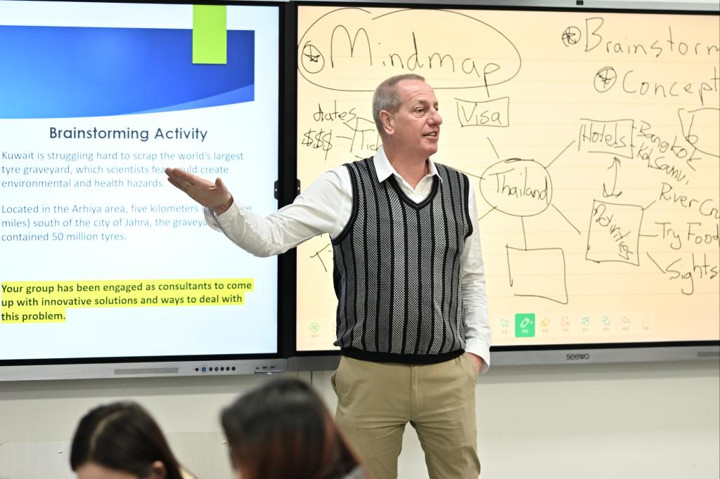 为全面掌握中外合作办学教学运行情况,切实保障教学运行秩序,充分发挥各级领导干部关心教学、重视教学、服务教学的指导作用,强化教学质量监控,2024年12月10日,副校长朱润晔携国际教育学院相关人员一起深入教学第一线,选听了外教Justin的《BSBSTR801管理创新思维和实践》课程。