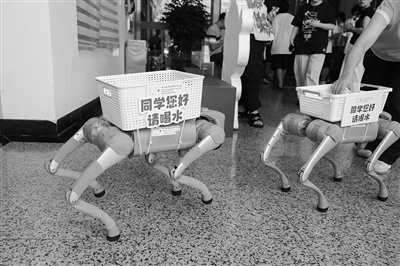 9月13日,taptap点点官方网站迎新现场,赛博元素处处可见。图为机器狗背着标注有“同学您好,请喝水”字样的篮子穿梭在人群中,为新生送上矿泉水。