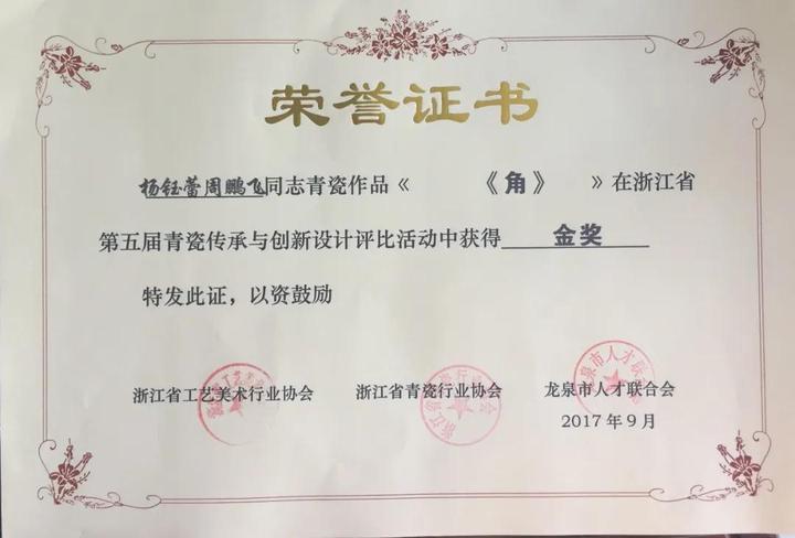产品1642杨钰蕾、周鹏飞同学作品《角》获第五届浙江省青瓷传承与创新设计展示评比活动金奖