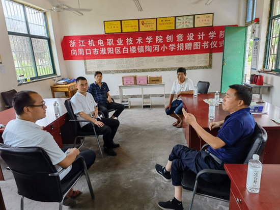 2021年7月22日上午9时,创意设计学院党总支心系河南洪水灾情,派员赴河南省周口市淮阳区白楼镇陶河小学开展灾情慰问与图书捐赠活动。共青团淮阳区委副书记段远鹏、白楼镇中心校党支部副书记、副校长曾祥军、白楼镇中心校党支部宣传委员、陶河小学校长刘炜、陶河小学副校长王义强、陶河行政村主任常勇以及taptap点点创意设计学院党总支委员刘博盛出席了慰问捐赠活动。