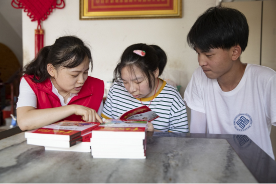 次日早上,光耀村党总支书记杨哲、副书记王欢向“助梦小队”师生介绍了光耀村的历史和文化,走访农户,参观水库和茶山,深入了解村里的乡村振兴、助农公益项目,以及未来的发展目标与方向。随后,师生们与村里的志愿者共同组建了两个“春泥计划”小组,一个小组探访村里的一名残疾儿童,为她诵读红色故事,一起做手工,并送上精心准备的手作礼品和玩具,为她营造健康、平等、友善的交流氛围,期待她能像同龄的孩子一样拥有快乐的童年;另一小组来到一户双胞胎家庭,为这对读小学的双胞胎姐妹辅导功课,讨论暑假的时间安排,讲述大学生活的趣事,与孩子们共度了充实而难忘的一天。