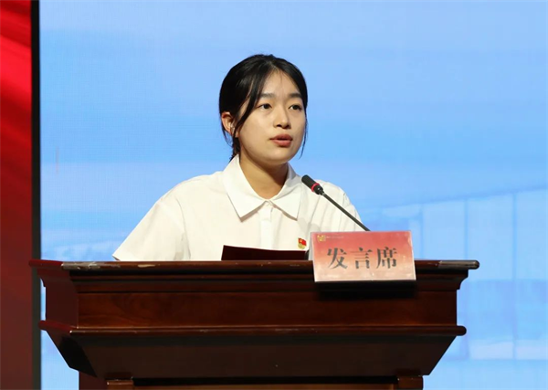 运达能源科技集团现代学徒制试点班学生代表、自动化学院机电2103班易子怡发言。她感谢学校提供的平台,并代表现代学徒制试点班学生表态,将严格要求自己,以实际行动来感恩学校和公司的培养,以青春力量报效祖国。