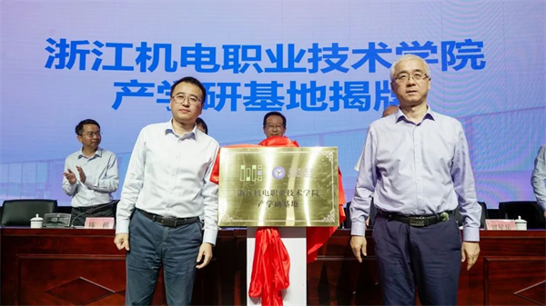 贺星岳、陈棋为浙江机电职业技术学院产学研基地揭牌。
