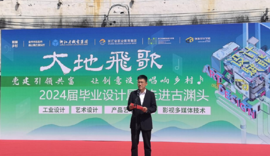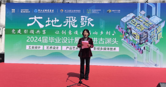 浙江机电职业技术学院党委委员、创意设计学院院长邓劲莲致辞。邓劲莲表示,此次毕业设计展乡村巡展,学院充分发挥资源优势、专业优势和人才优势,引导师生将教学实践、社会服务根植于广阔农村,努力探索职业教育服务和美乡村建设的新模式、新路径,通过学生们的创新设计,为乡村振兴战略注入新的活力。