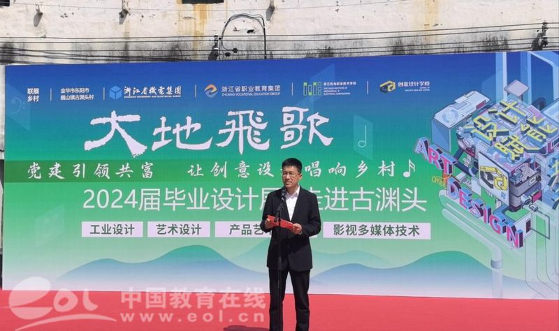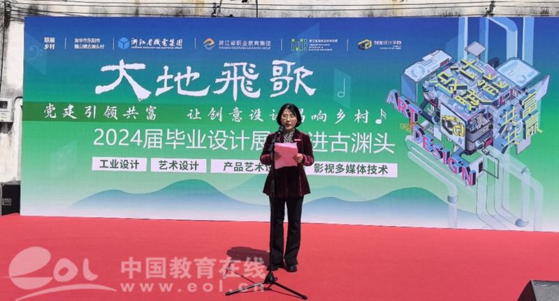 浙江机电职业技术学院党委委员、创意设计学院院长邓劲莲致辞。邓劲莲表示,此次毕业设计展乡村巡展,学院充分发挥资源优势、专业优势和人才优势,引导师生将教学实践、社会服务根植于广阔农村,努力探索职业教育服务和美乡村建设的新模式、新路径,通过学生们的创新设计,为乡村振兴战略注入新的活力。