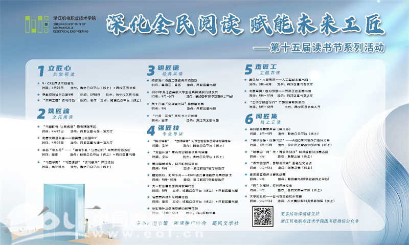 在4月23日世界读书日来临之际,浙江机电职业技术学院以“深化全民阅读 赋能未来工匠”为主题开展了第十五届读书节活动,通过名家领读、全民阅读、经典共读、专业导读和主题荐读等五个系列28项活动,为广大师生提供了共沐书香、交流思想的平台,有力促进了师生阅读素养提升,进一步营造了全民阅读校园文化氛围。