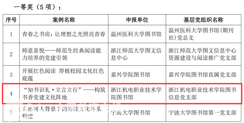 近日,浙江省高等学校图书情报工作委员会公布了2023年浙江省高校图书馆基层党建创新典型案例的评比结果,浙江机电职业技术学院报送的“‘知书识礼·立言立行’——构筑书香党建文化阵地”案例脱颖而出,荣获一等奖,成为唯一一所获此殊荣的高职院校。