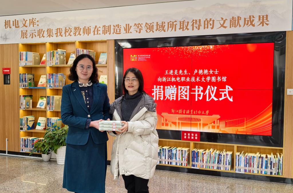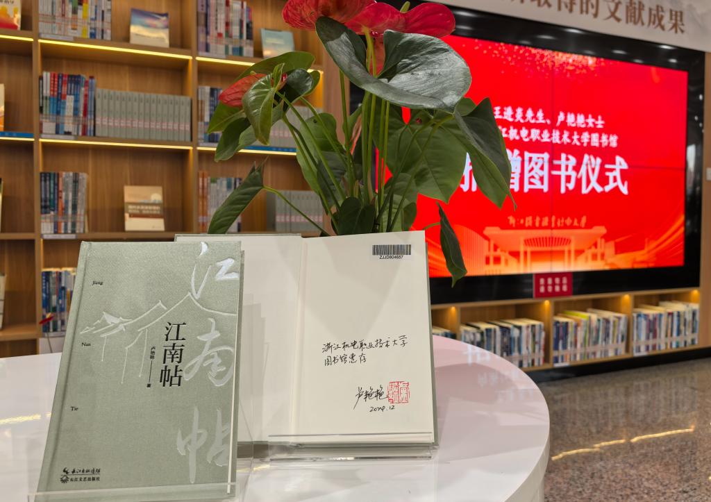 卢艳艳老师还带来了著作《江南帖》,该书由爱心人士王进炎先生购买并捐赠给浙机电大。图书馆馆长周秀梅对王进炎、卢艳艳的捐赠表示诚挚感谢,并为其颁发图书捐赠证书。