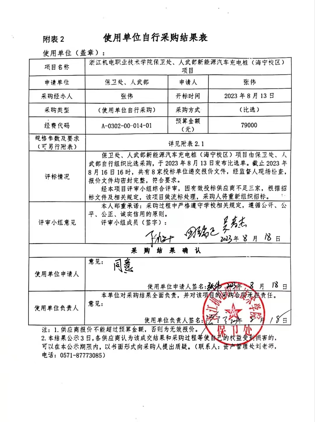 浙江机电职业技术学院保卫处、人武部新能源汽车充电桩(海宁校区)项目采购结果