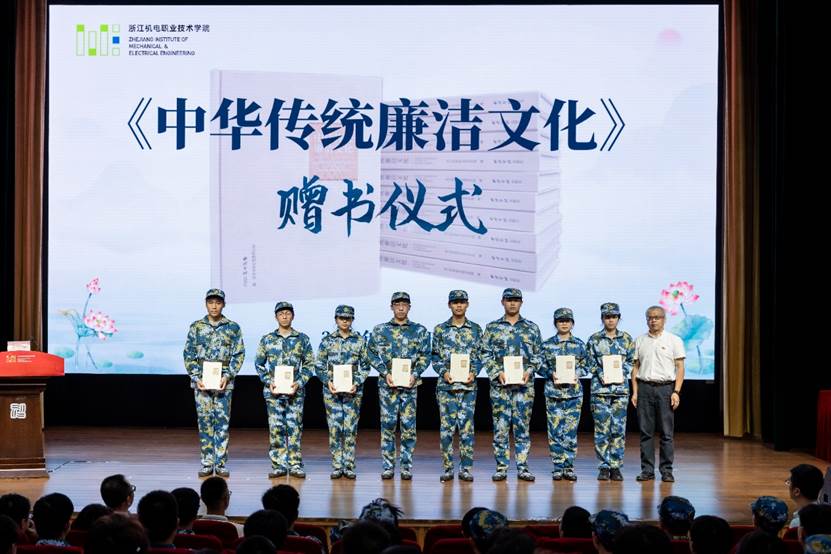 在赠书仪式环节,各二级学院共8名学生代表上台领取了新书。《中华传统廉洁文化》的正式出版是学校廉洁文化建设上的一件大事,为了让全体师生共享建设成果,学校将连续三年在全校新生和教职工中发放本书。