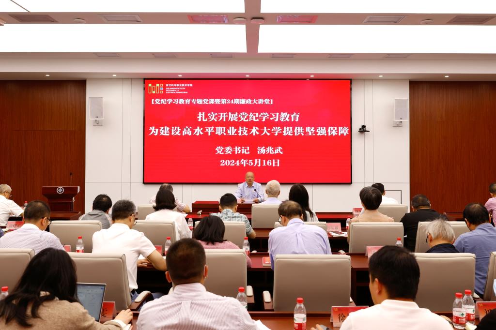 为深入学习贯彻习近平总书记关于党纪学习教育重要讲话和重要指示批示精神,学习贯彻《中国共产党纪律处分条例》,进一步深化和加强对党的纪律建设重要性的认识,教育引导党员干部学纪、知纪、明纪、守纪,持续推进全面从严治党走深走实。5月16日,学校纪委举办了第二十四期廉政大讲堂,党委书记汤兆武及党委班子其他成员、全体中层干部参加会议。