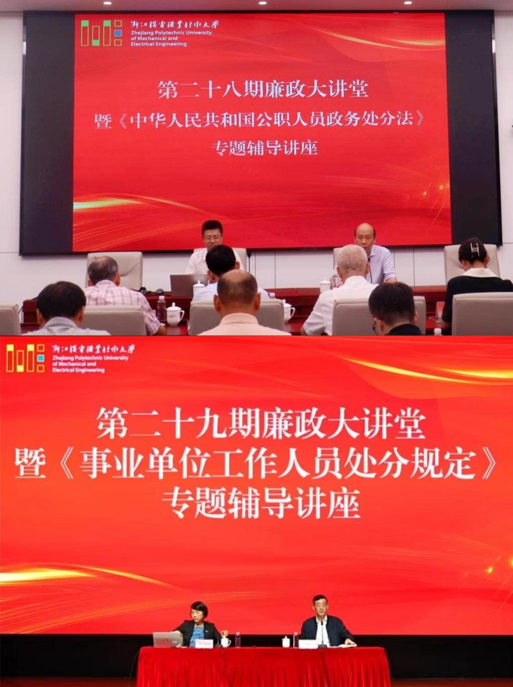 为扎实推进党纪学习教育常态化长效化,学校组织开展第二十八、二十九期“廉政大讲堂”,邀请专家围绕《中华人民共和国公职人员政务处分法》《事业单位工作人员处分规定》开展专题解读,详细阐释立法定规依据、适用对象、处分种类及适用范围,深入剖析两部法规制度设计的差异和处理违纪违法行为的异同。通过生动案例和真实故事,增强全校领导干部、教职工依法履职、廉洁用权的思想自觉和行动自觉,形成“分层抓学习、分类强约束、全员守纪律”的良好格局。