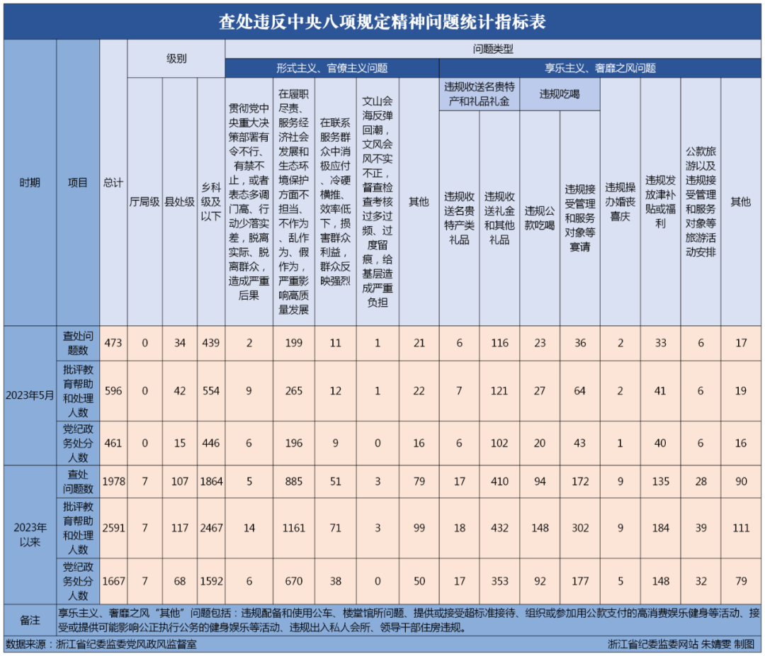 2023年5月全省各级纪检监察机关共查处违反中央八项规定精神问题473起,批评教育帮助和处理596人,其中党纪政务处分461人。