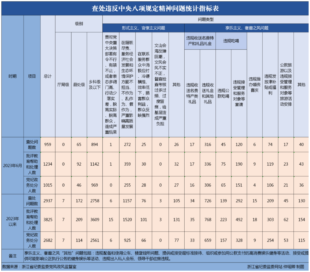 2023年6月全省各级纪检监察机关共查处违反中央八项规定精神问题959起,批评教育帮助和处理1234人,其中党纪政务处分1015人。查处形式主义、官僚主义问题324起,其中,在履职尽责、服务经济社会发展和生态环境保护方面不担当、不作为、乱作为、假作为,严重影响高质量发展问题272起,占查处形式主义、官僚主义问题总数的84%。