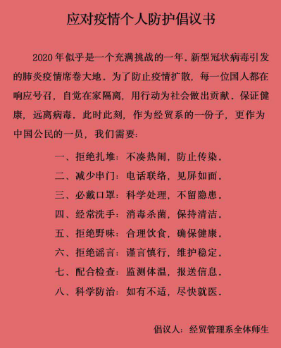 2020年春节前夕,新型冠状病毒感染的肺炎病魔席卷全国。面对突如其来的疫情,中原大地奋起抗击。作为当代大学生,经贸管理系团总支也积极响应,在全体同学中发起倡议号召,以各种形式,共同抗击新冠疫情。