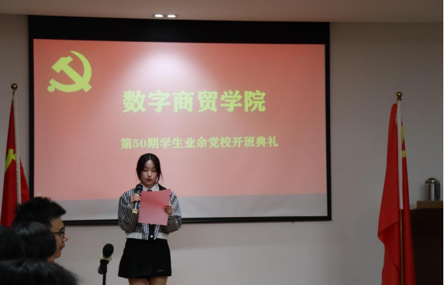 随着程书记的讲话结束,数字商贸学院第50期学生业余党校的开班典礼顺利完成。希望学员们通过参加本期业余党校的培训学习,能进一步增强对党的认识,坚定共产主义理想信念,早日在思想和行动上达到合格党员的要求,展现出我院青年的担当姿态和昂扬风貌。