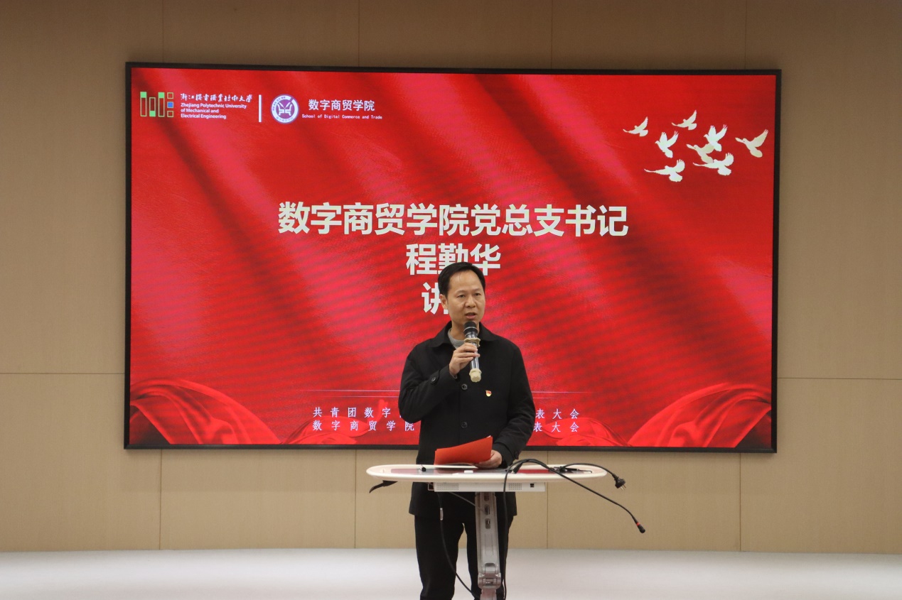 在全校上下深入学习贯彻落实党的二十届三中全会精神之际,在努力冲刺“新双高”关键之刻,在全体师生奋力创建在高水平职业技术大学之时,11 月 27 日晚 17:30,共青团数字商贸学院第二次团员代表大会、学院第四次学生代表大会(以下简称团学“双代会”)在海宁校区 19 号楼 106 会议室顺利召开。数字商贸学院党总支书记程勤华、党总支副书记李君、团总支书记杨秀飞、全体辅导员、学院第十八届团总支学生会委员以及各团支部学生代表共 120 余人出席本次大会。
