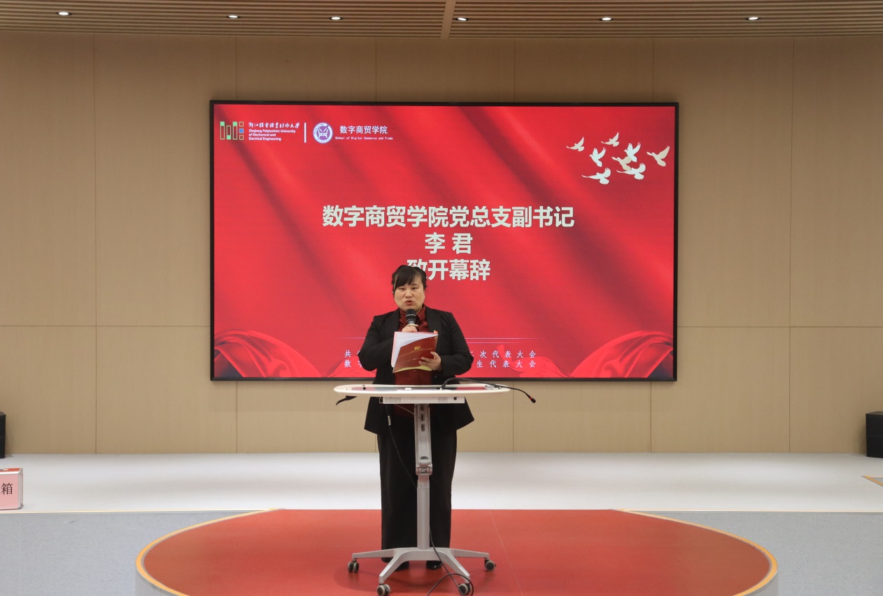 大会在庄严的国歌声中正式拉开帷幕。数字商贸学院党总支副书记李君致开幕词。她首先代表学院全体领导班子,向一直以来关心和支持我院共青团事业的各级业务主管部门表达崇高敬意与诚挚感谢,并以大会名义,向第十八届团总支学生会委员、广大团员和青年学子致以亲切问候与诚挚的祝愿。李书记指出,学院团总支学生会始终秉持“求实、求精、求新”的校训,坚守以生为本、积极进取的工作理念,团结广大青年学子,在组织建设、思想引领、校园文化、社会实践、社团建设、服务学生、平安校园等多个方面奠定了坚实基础,在提高学生综合素质、繁荣校园文化、促进学风建设等方面发挥了关键作用,为学校高水平职业技术大学的发展添上了浓墨重彩的一笔。