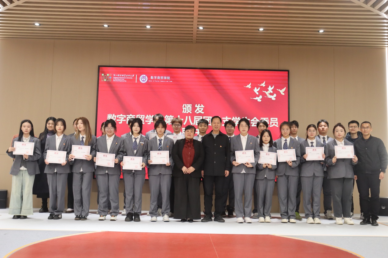 最后,学院党总支书记程勤华代表学院党政领导班子向大会的成功召开表示热烈祝贺。程书记强调学院的团学代会是全院青年政治生活中的大事,它承载着全体商贸学子对过去一年工作的回顾和总结,更寄托着对未来发展的期望与憧憬。在历届团总支学生会的共同努力下我们取得一系列令人瞩目的成绩:蝉联三次校运动会道德风尚奖,每年运动会女子团体总分第一,2024年我们更是获得了中国国际大学生创新大赛国赛金奖的历史最好成绩。从精彩纷呈的校园活动到在各项赛事中为学院争得荣誉的拼搏瞬间,每一项成功都凝聚团队的力量,也是青春奋斗的精彩华章。对于新一届团总支学生会,程书记要求大家能够秉承团学工作的优良传统,以服务同学为宗旨,以提升校园文化品质为目标,以“三求”校训为行动指南,积极发挥桥梁和纽带作用,不断创新工作方式方法,运用现代信息技术手段,拓展团学工作的广度和深度,持续打造一个充满凝聚力和战斗力的团学组织。程书记还代表学院对第十八届团总支学生会全体成员过去一年的辛苦付出表达衷心的感谢,并为全体十八届委员颁发聘书。