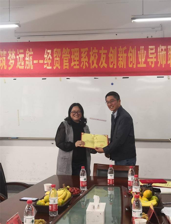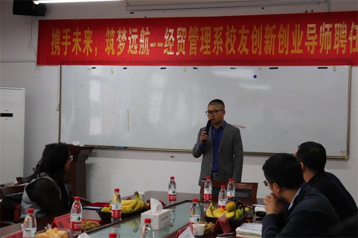 系党总支副书记符强介绍了经贸管理系学生创新创业的开展情况,表示双创工作是学院重点工作,对各位优秀校友能在百忙之中接受母校的邀请担任经贸系校友创新创业导师表示感谢,希望校友导师能利用自身的资源和丰富的创业经验积极参与学生创新创业的指导工作。提出今后在汇聚各方面校友资源的基础上搭建一个完善的校友创新创业共享平台,推动经贸系创新创业上一个新台阶。