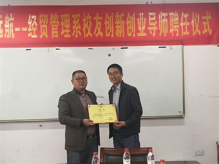 系党总支书记鲁明为校友创新创业导师颁发了聘书。校友导师代表施超深情表达了对母校的感恩之情,表示母校是自己人生赢家的起点,分享了自己的创业经历和感悟,认为母校的发展给自身的发展也带来了很多机遇,得益于母校的培养,让自己在创业过程中拥有克服困难的勇气与智慧。校友导师万里通、胡瑞宾、江东雅分别表达了回到母校的激动之情,讲述了各自的工作和创业的经历。表示将尽自己所能,为母校创新创业工作贡献力量。
