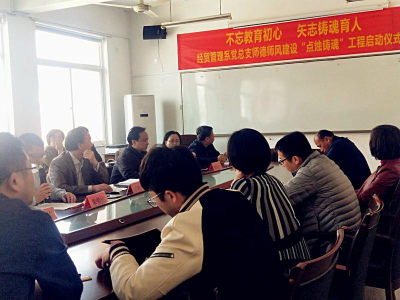 为深入学习贯彻落实全国全省高校思政工作会议精神,努力践行习近平总书记对广大教师提出的“四有好老师”、“四个引路人”和“四个相统一”的明确指示与要求,进一步加强师德师风建设,3月29日下午,经贸管理系党总支师德师风建设“点烛铸魂”工程启动仪式在2-302室举行。学院党委委员、院长助理丁明军出席启动仪式,经贸管理系全体教师参加启动仪式。启动仪式由经贸管理系党总支副书记朱爱民主持。