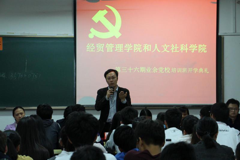 期业余党校开班典礼隆重举行,参加此次典礼的有经贸管理学院党总支书记张伟老师,人文社科学院团总支书记覃湘庸老师,经贸管理学院宣传纪检委员孙跃兰老师、会计专业支部书记李君老师、国际贸易专业支部书记陈竹韵老师、管理类支部书记张新亭老师和组织员林国强老师。