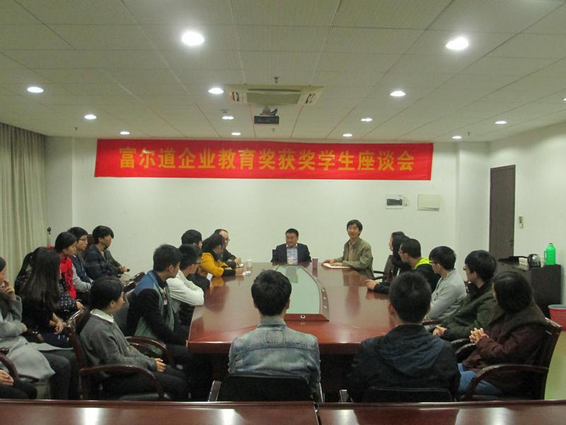 晚,经贸管理学院在综合楼1101举行“富尔道企业教育奖获奖学生座会”。天津富尔道贵金属经营有限公司董事长兼总裁黄晓刚先生、总经理柳刘祖未先生亲临座谈会,富尔道企业教育奖获奖学生参加了座谈会,会议由包发根院长主持。