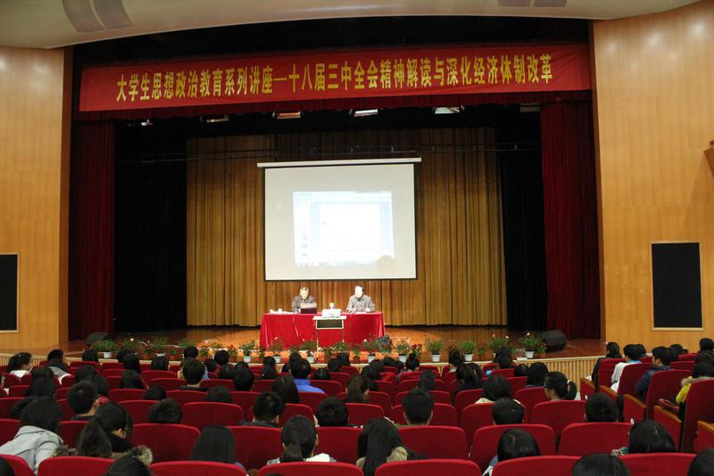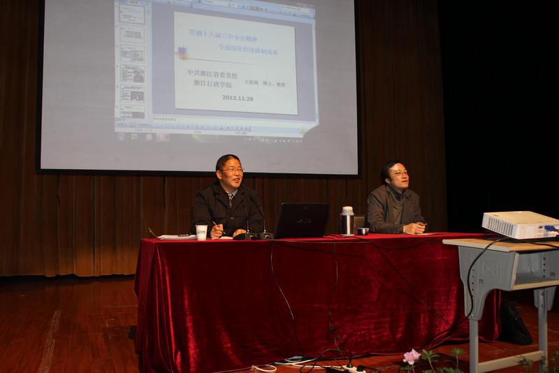 11月28日晚,大学生思想政治教育系列讲座第七讲“十八届三中全会精神解读及深化经济体制改革”在五号楼报告厅进行,本次讲座由人文社科学院和我院联合举办,讲座有幸邀请到了中共浙江省委党校经济学教研部主任、软科学研究所所长王祖强教授作为主讲人。我院部分教师、全体大一学生、业余党校学员、励志班学员、团总支学生会委员参加讲座,讲座由院党总支书记张伟主持。